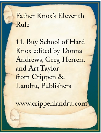 Father Knox was an early twentieth century mystery writer, who was also a member of the Detection Club, along with contemporaries like G. K. Chesterton and Agatha Christie–speaking of rarefied air–and he came up with the ten commandments for mystery novels: