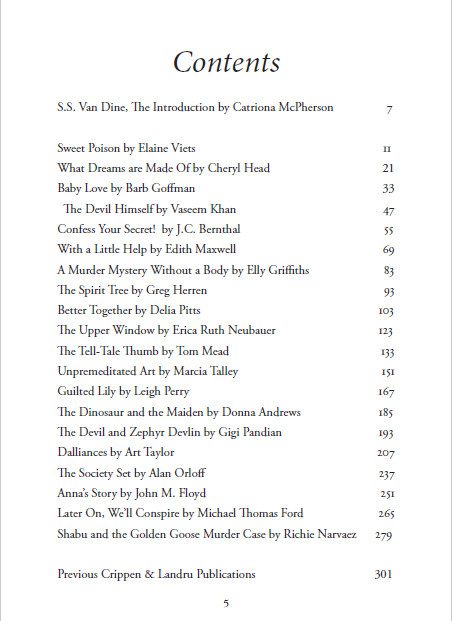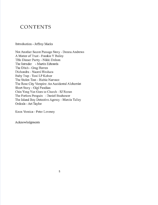 Introduction – Jeffrey Marks Not Another Secret Passage Story – Donna Andrews A Matter of Trust – Frankie Y Bailey THe Dinner Partty – Nikki Dolson The Intruder – Martin Edwards The Ditch – Greg Herren Dichondra – Naomi Hirahara Baby Trap – Toni LP Kelner The Stolen Tent – Richie Narvaez The Rose City Vampire: An Accidental Alchemist Short Story – Gigi Pandian Chin Yong Yun Goes to Church – SJ Rozan The Forlorn Penguin – Daniel Stashower The Island Boy Detective Agency – Marcia Talley Ordeals – Art Taylor Knox Vomica – Peter Lovesey