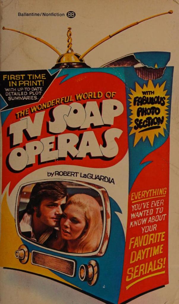 It was already out of date; at the time it was published the most popular show airing was NBC’s Another World (General Hospital was breaking all ratings records in the present day), so a lot of the book, when talking about modern times, focused on Another World, and its primary ratings driver, the love triangle between Steve, Alice and Rachel (George Reinholt, Jacqueline Courtney, first Robin Strasser and then Victoria Wyndham as Rachel; Reinholt and Courtney made the book’s cover). By the time I got to the book, Another World‘s ratings were already in free fall and ABC was in firm control of daytime’s ratings. It was also more of a puff piece rather than any in-depth reporting and digging. It was all about how talented and hard-working every one involved in daytime was, and conflicts and other off-camera issues were completely ignored. (It was updated several times, and the last edition I had a copy of, Soap World, was much better and not so “aren’t they all AMAZING?”)