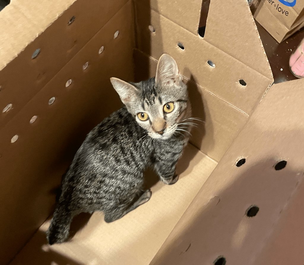 His name, already given to him when we picked him, is Rum-Tum-Tugger (I announced it incorrectly on social media yesterday with a typo calling him Tigger by mistake) and that will probably change as we get to know him better; he doesn’t know the name at all. He’s almost five months old, and is completely fearless. I wanted to take all the cats home (and the dogs, too; it’s always so sad to me to see their hopeful faces and their wagging tails, thinking you might be their rescuer. All the cats we met were sweet, some a little shy (Sing out Louise!) which made me sad because they seemed to put some effort into making friends, but are apparently used to not being picked they gave up trying to win us over once we walked away from them. Tug was having none of that, and let us know he was the only cat for us. He has the cutest little meow, and there was no shyness at all once we got him home; he fearlessly explored the entire apartment, made cuddle time as well as let us both know, with head butts and purrs and exposed belly and making biscuits, that he was happy to have his Forever Home. I woke up this morning to him purring and curled up next to me on my pillow, and last night he followed Paul up to bed–and then came back down looking for me the way Scooter used to–hey, it’s bed time! He’s a kitten so he’s very playful–he made toys out of wrappers and dust and whatever he could find on the floor–he chased my highlighter around on the floor for a good half an hour or so.