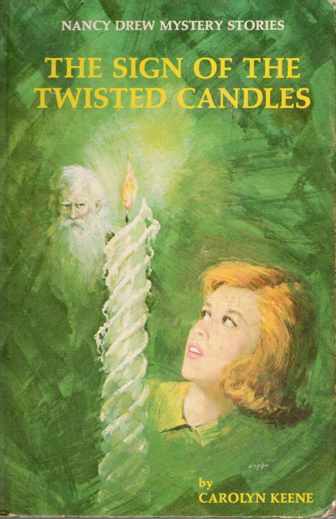 Most of my collection of Nancy Drew mysteries–and all the other kids’ series I collect–are currently in boxes in my storage attic. There just isn’t room to have them out on display (which makes me crazy, but it’s either that or the copies of my own books, and my vanity trumps not displaying the books every time), because I do have copies of every Nancy Drew except for maybe one or two, and there are some revised editions I don’t have. Shortly after I got to the age where I could actually buy them with my own money, the editions changed; they went from the old flat matte covers to what aficionados and collectors call “the flashlight editions”, because there’s a flashlight as the logo on the spine (rather than the little black box with Nancy in profile) and they went to a glossy cover; also on the cover where NANCY DREW MYSTERY STORIES was changed to a banner across the top in yellow (the Hardy Boys’ banner was blue), and I didn’t like the new glossy covers or the flashlight editions or the banner…plus, I wasn’t going to start over and collect them all in this new format; this was when I started looking for them at yard sales, second hand stores, and flea markets (before the Internet and ebay).