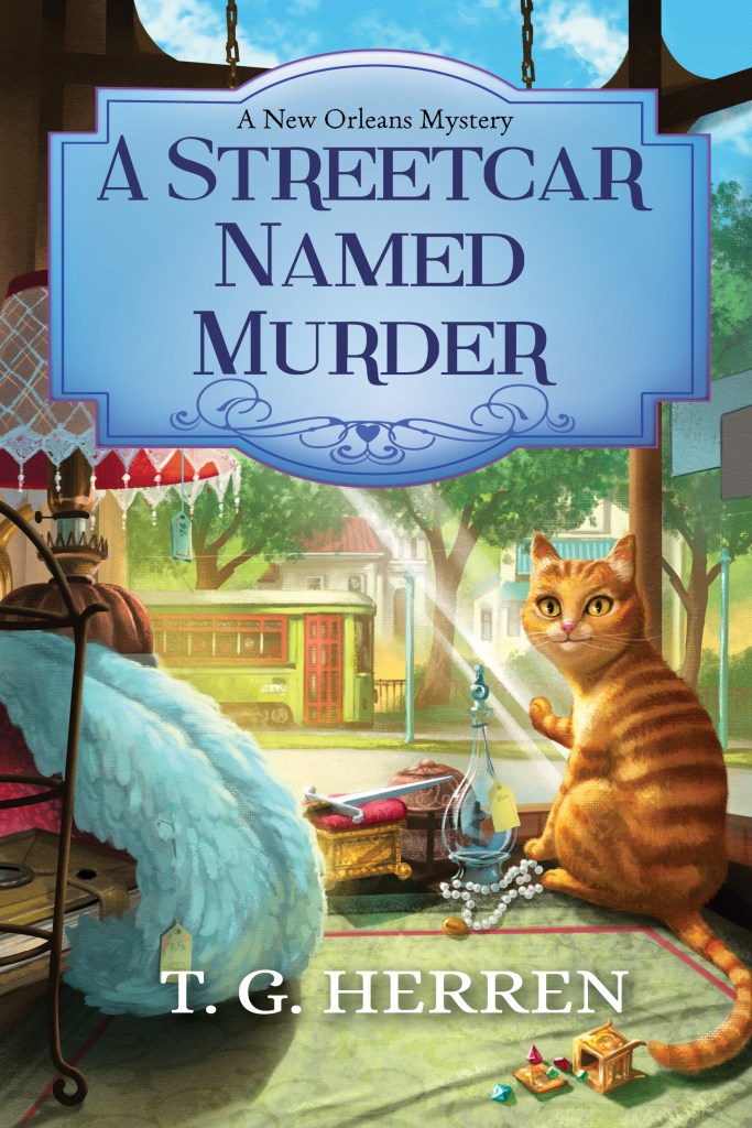 It literally has everything I love (well, most of it, at any rate): the St. Charles streetcar, Scooter, and all kinds of fun antiques and artifacts–and so brightly colored and beautiful. They even slipped in a strand of beads cleverly disguised as pearls! It is one of my favorite covers, and not just because it doesn’t have a shirtless man on the cover–I know, I know, it’s been awhile since I actually had one–certainly it’s been since Royal Street Reveillon–oops, no, Survivor’s Guilt and Other Stories is post Royal Street Reveillon, so I guess it’s just the last two young adults and this one since then. And as I said, I really love the color scheme. I may have to have this blown up into a poster and have it framed–that’s how much I love it.