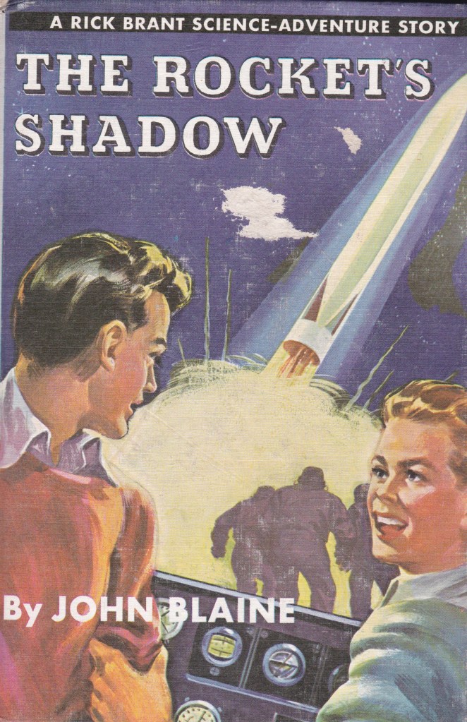 When I first read The Rocket’s Shadow in the late 1960s/early 1970s, it was already significantly dated. Originally published in either 1946 or 1947, the background to the story was that the scientists on Spindrift Island, off the coast of New Jersey, were trying to build a rocket to send to the moon. Several different groups were trying to accomplish this, and whoever succeeds first was going to get a very lucrative government contract…and their efforts are being sabotaged. Rick’s father, Dr. Hartson Brant, is world-renowned, and of course Rick is very interested in science and is always inventing things to either save time or effort, and they aren’t usually very practical, even though they do work. Rick and his younger sister Barby go to school on the mainland–Spindrift is separated from the coast by tidal flats that are underwater during high tide–but everyone on the island is determined that their rocket will succeed and they’ll catch the saboteurs.