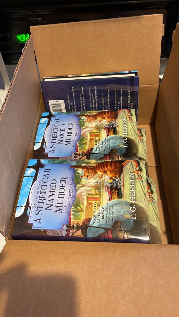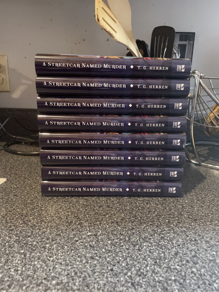 If you follow me on social media you will know already that I got my box o’books of A Streetcar Named Murder this week. The book looks stunningly beautiful, seriously; I couldn’t be more pleased with everything about the book’s packaging. The cover is gorgeous; and stacked up together they look especially gorgeous, as you can see in these delightful images from my kitchen counter.